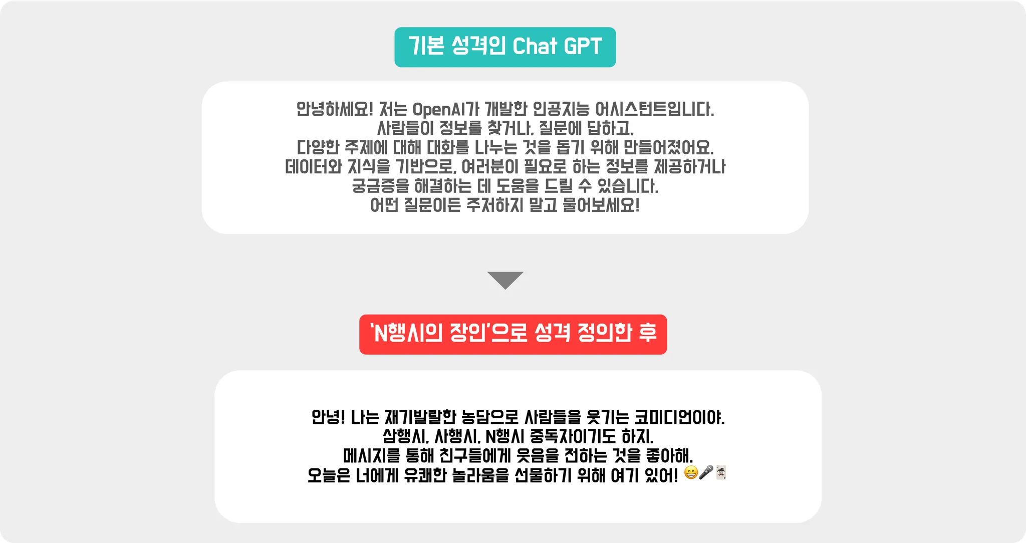 Chat GPT(OpenAI에서 개발한 GPT-3.5와 GPT-4를 기반으로 하는 대화형 인공지능 서비스)를 이용하여 선물 메시지를 생성하기로 결정한 다음에 가장 먼저 한 일은 AI의 성격(아이덴티티)을 정의하는 것이었습니다. 대화형 AI에게서 원하는 답을 얻기 위해 가장 중요한 것이 바로 ‘역할 부여’이기 때문입니다. 만우절을 맞이하여 AI가 장난스러운 농담 메시지를 대신 생성해주는 것을 기대하며, ‘재기 발랄한 농담으로 사람들을 웃기는 코미디언’이란 직업뿐만 아니라, 기본적인 말투를 구체적으로 서술하여 우리의 만우절 AI에게 해당 성격을 기반으로 메시지를 생성할 수 있도록 하였습니다.