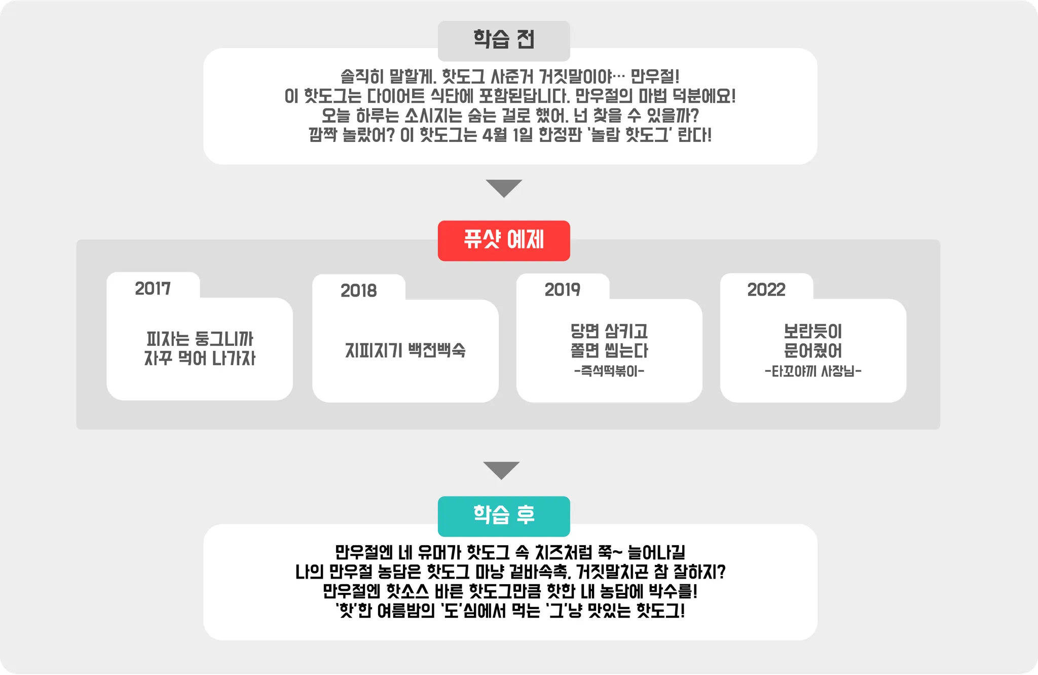 ‘만우절 핫도그’ 카드에 어울리는 메시지를 추천해달라고 할 때퓨샷러닝 전에는 ‘만우절’, ‘핫도그’ 단어를 활용한 문장을 만들어주는 반면,퓨샷러닝 후에는 AI가 음식 이름을 활용하여 ‘치즈처럼 쭉~ 늘어나길’, ‘겉바속촉’ 등과 같은 다양한 표현과 음식 이름으로 삼행시 문장을 생성하게 되었습니다.