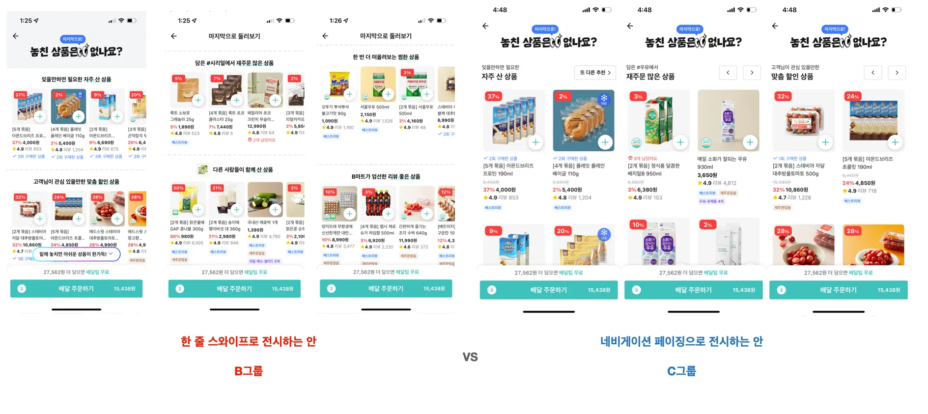 또 다른 예시로는 최근까지도 실장님께 당당하게 winner 일 것이라고, 호언장담했던 UX 실험안 B그룹의 지표가 실험안 C그룹보다 낮은 경우들도 있어 뇌피셜을 반성하던 순간들도 있었고요.