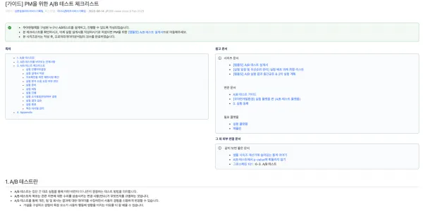 실험 연동 방법 부터, 플랫폼 사용법, 실험 설계서 작성, 분석 리포트 양식까지 내용이 방대하기 때문에 개인이 혼자 진행하는 것보다 조직차원에서 함께 협업, 보완할 수 있으면 좋습니다. (저희도 실험연동 방법, 플랫폼 사용법은 공통서비스개발팀에서 따로 작성했습니다.)