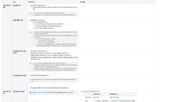 실험허들을 낮추기 위한 보완책으로 본 글을 읽는 분들이 활용하실 수 있도록 글 최하단에, 사내에 공유했던 실험 체크리스트와 실험 설계서 탬플릿 일부를 첨부합니다.