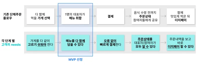 단체주문의 플로우를 생각한 뒤, 그에 맞는 고객의 needs를 도출합니다. 그 후, 가장 필수적인 기능을 MVP 로 정의하는 과정을 거칩니다.