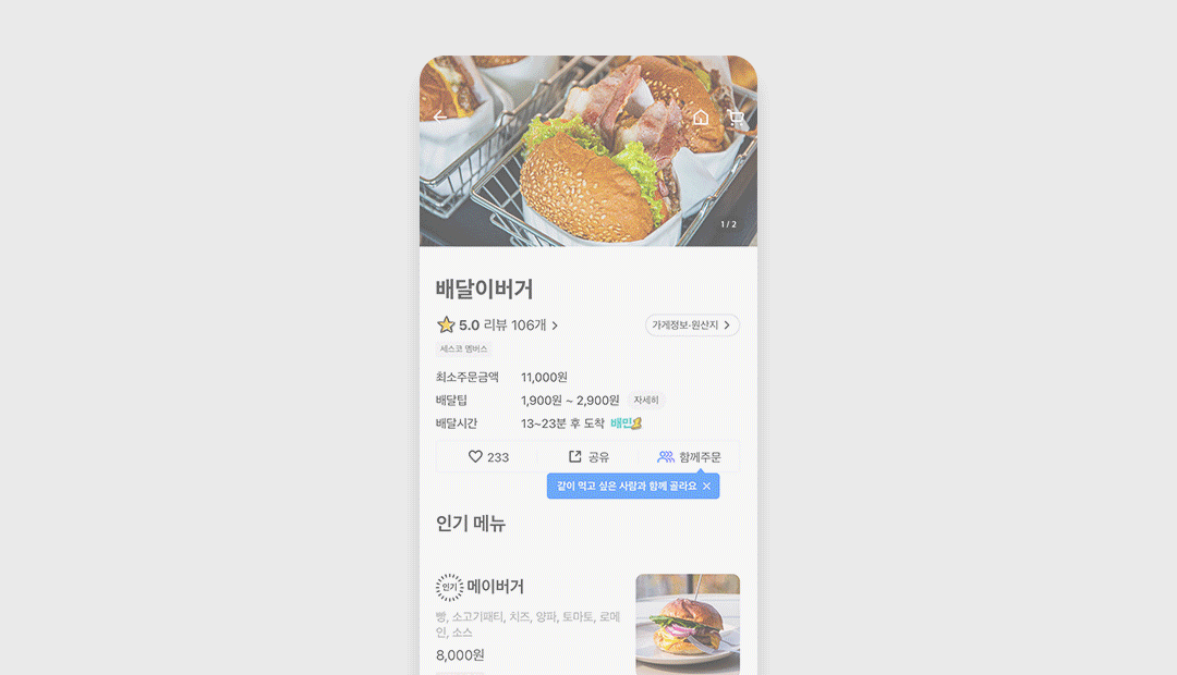 하지만 한편으로 경쟁사의 서비스와 배민의 함께주문이 이름은 비슷하지만 다르게 만들어졌다는 점도 흥미로웠습니다.