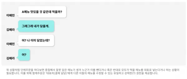 이 함께주문이 시작된 배경인, ‘오류 없이’ 메뉴를 담고 주문하는 것이 가장 중요한 가치일 것입니다. 오류없이 주문이 되려면 서로의 메뉴를 함부로 수정할 수 없도록 해야 한다 생각했습니다. 반면에 아래와 같은 상황이 발생한다면 누군가에게는 메뉴 수정 권한이 있어야 쉬울 텐데요. 이 권한은 결제 담당자가 가지는 것이 가장 적절하다 생각했습니다.